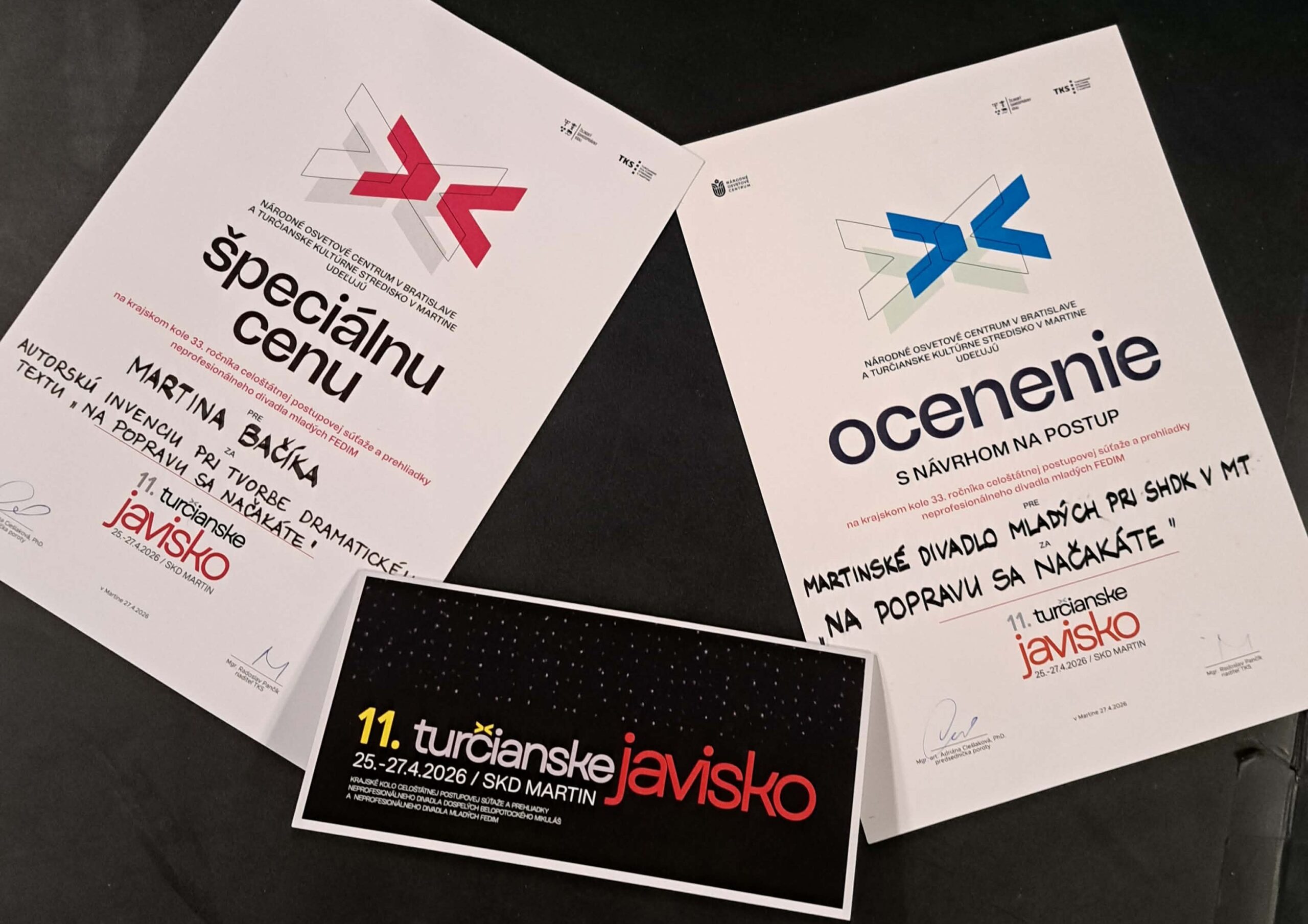 Od 25. do 27. apríla 2026 Martin už tradične hostil krajskú prehliadku neprofesionálneho divadla – Turčianske javisko. V rámci časti, kde súťažili divadlá mladých sa predstavilo aj naše školské divadlo (Martinské divadlo mladých) s autorskou inscenáciu Na popravu sa načakáte, ktorú vytvorili študenti 2. a 3. ročníka Martin Bačík, Peter Belica a Miroslav Gočal. Chalani si odniesli cenu s návrhom na postup do celoštátneho kola a Martin Bačík aj špeciálnu cenu za autorskú invenciu pri tvorbe dramatického textu. Gratulujeme, chalani! Držíme palce a sme na vás hrdí!